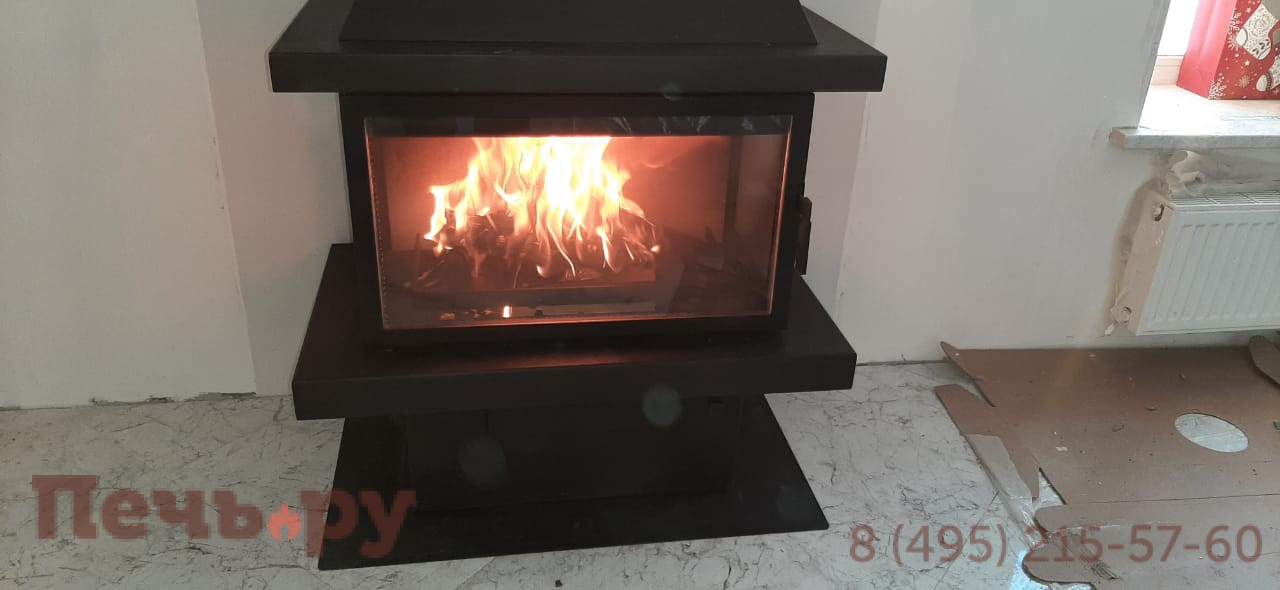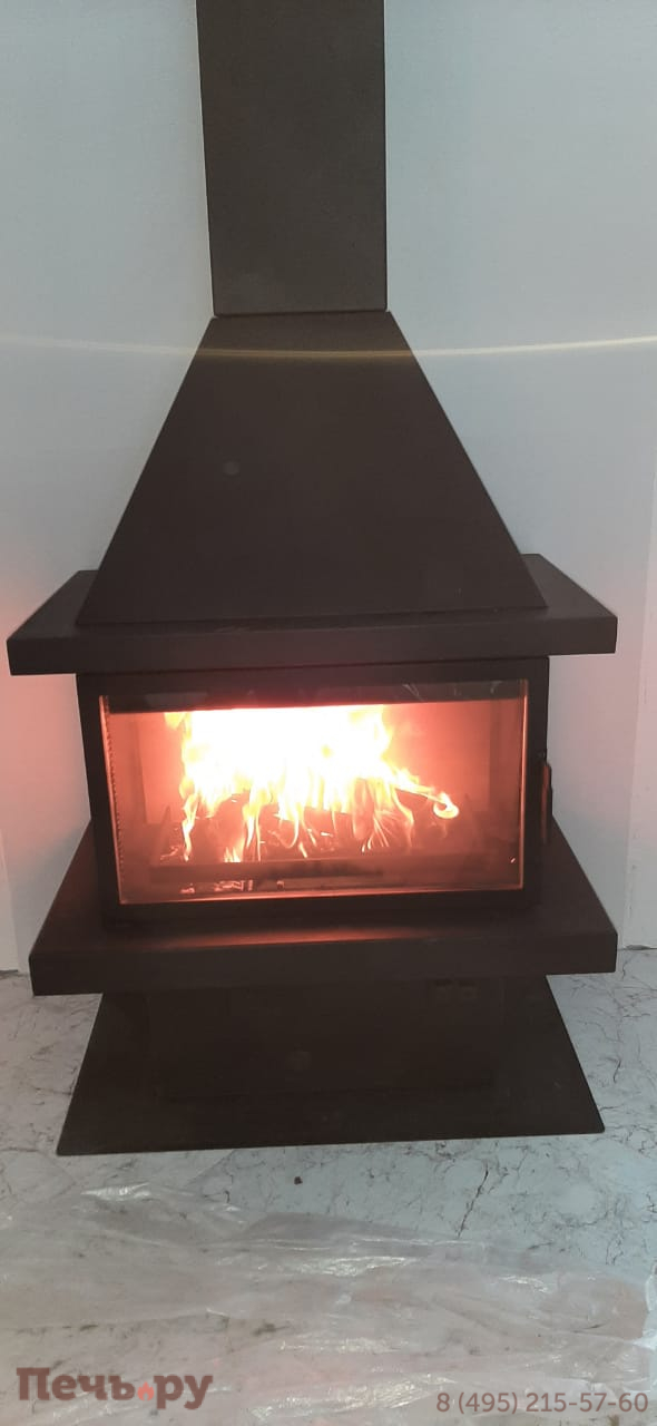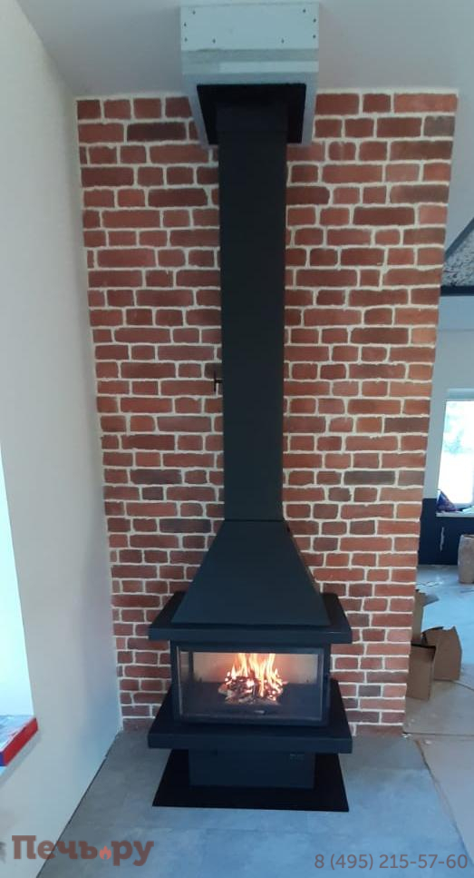 прямоугольную форму, дымоход с выходом сверху и пристенное расположение. Труба дымохода скрыта под металлическим кожухом, который завершает стильный образ