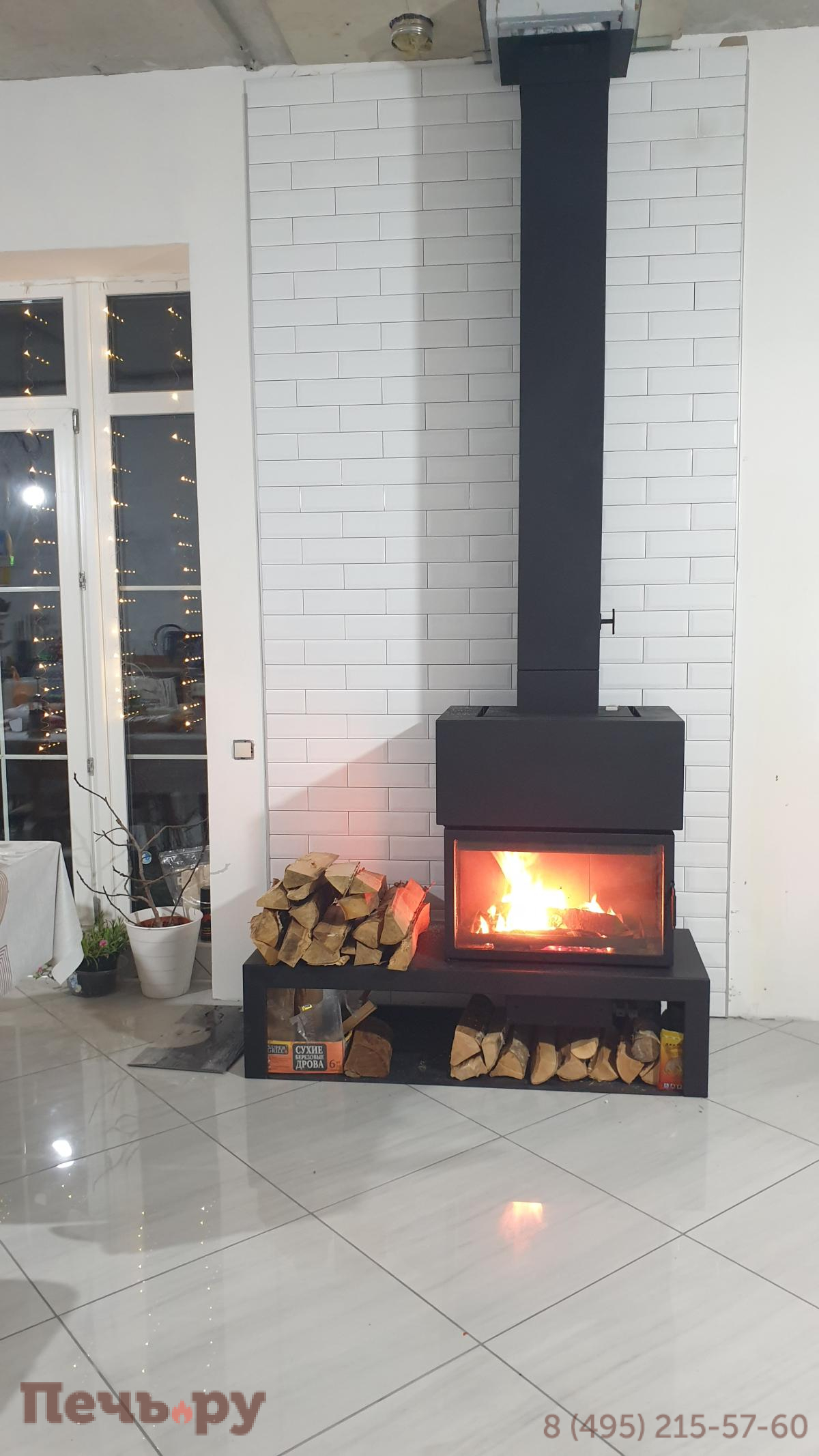 прямоугольную форму, дымоход с выходом сверху и пристенное расположение. Труба дымохода скрыта под металлическим кожухом, который завершает стильный образ