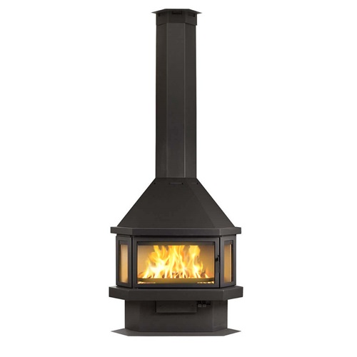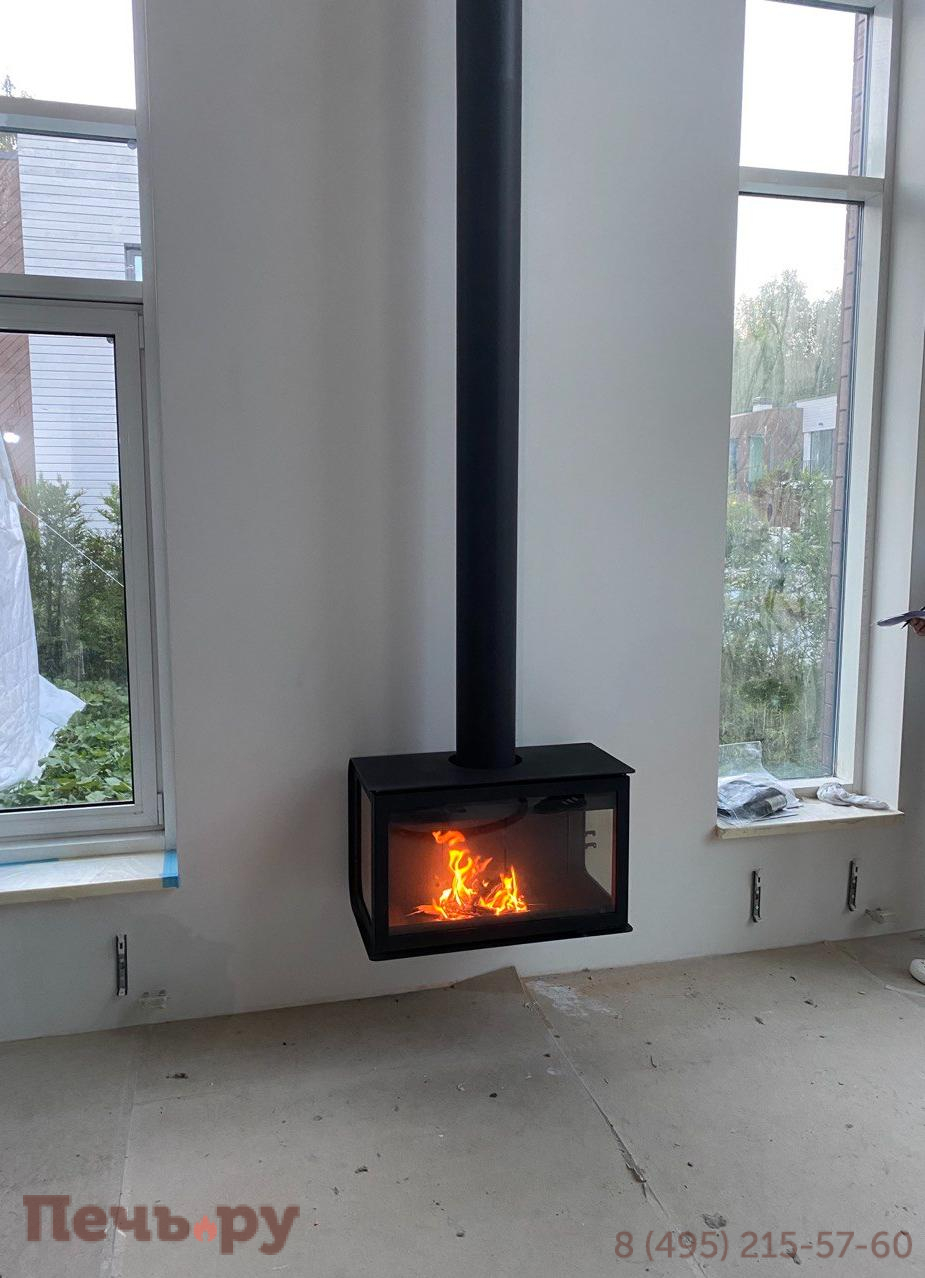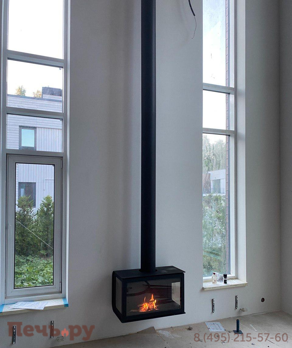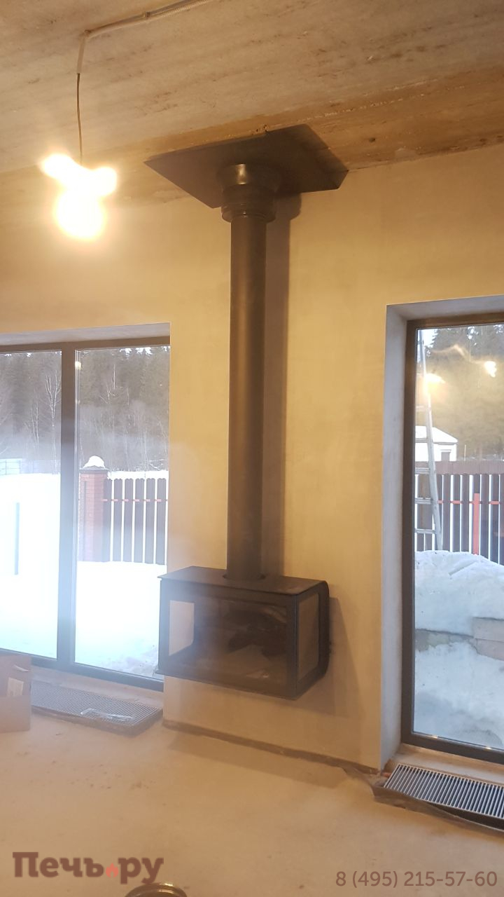 прямоугольную форму, дымоход с выходом сверху и пристенное расположение. Труба дымохода скрыта под металлическим кожухом, который завершает стильный образ